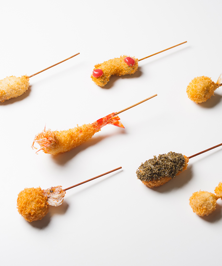 串揚げとワインで特別な ひとときを 全国の生産者から直送される季節ごとの旬の食材を厳選し、 ひと手間もふた手間もかけ丁寧に串に刺しています。 創作したひと串ひと串で、初めての美味食感をお楽しみ下さい。